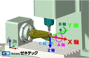 X軸の周りを回転する円形動作の軸。度数で表します。下の図は回転4軸の工作機械でA軸が回るタイプです。